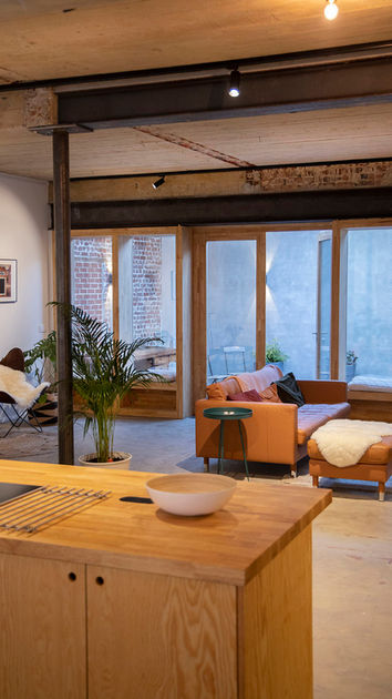 Onze passies literatuur, architectuur en fotografie waren de inspiratie tot het renoveren van deze aanpalende loft. De originele structuur, beton en ijzer in combinatie met nieuw massief hout voltooit het sfeervol logeren in Kortrijk.
